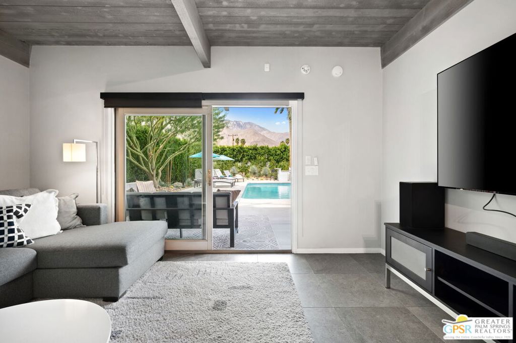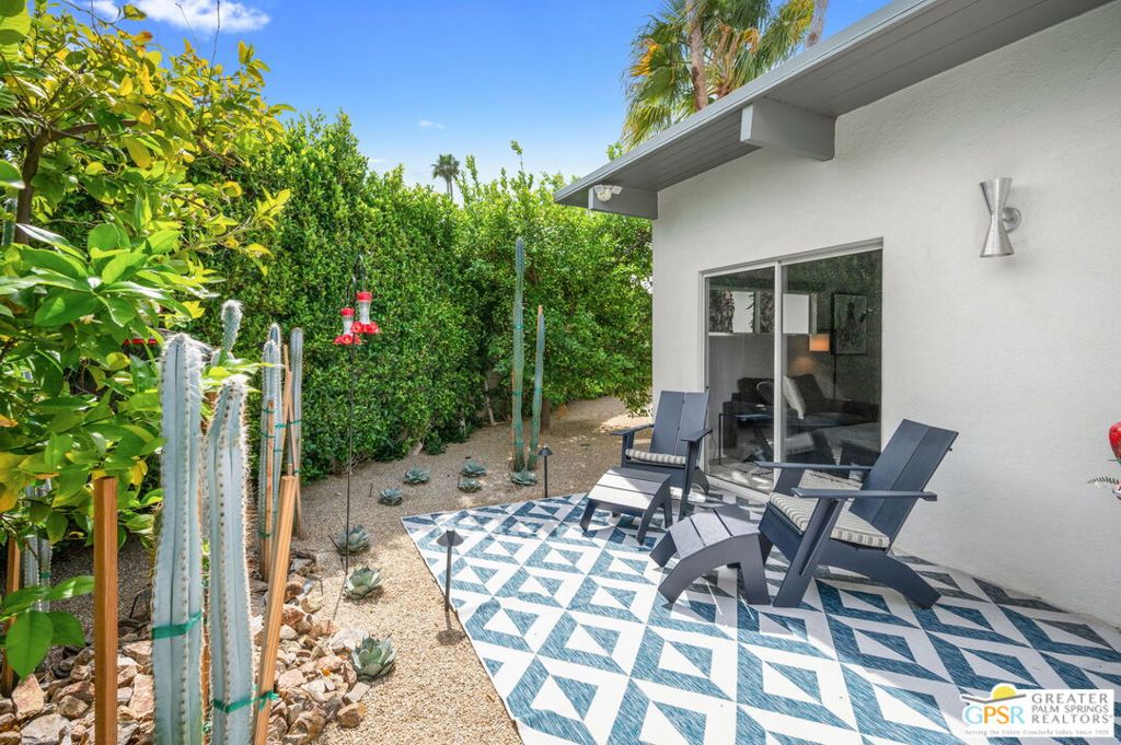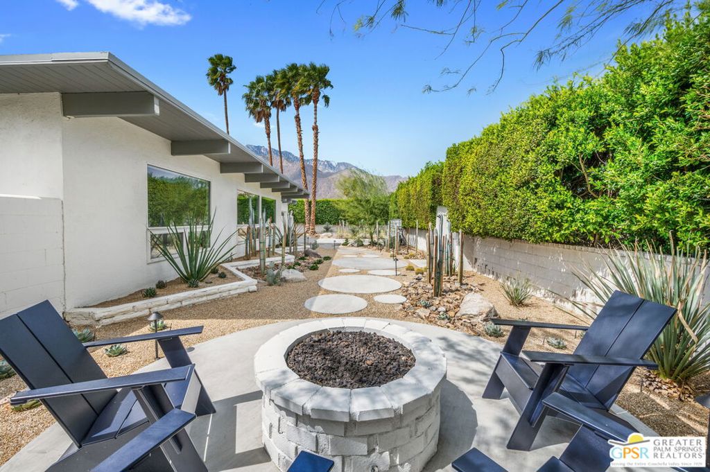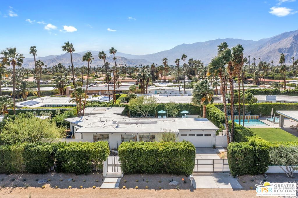 Tucked behind a lush privacy hedge, this spectacular mid-century modern residence is the crown jewel of the block where timeless design meets sophisticated upgrades and stunning mountain views steal the show. Expansive walls of glass flood the interiors with natural light, seamlessly blending indoor and outdoor living. The resort-style saline pool and professionally designed garden create an oasis of relaxation and beauty, framed by mountain vistas and curated landscape lighting. At the heart of the home, the chef's kitchen centers around an oversized island, perfect for both casual mornings and lively gatherings. The main house offers three serene bedrooms including two with direct outdoor access and two spa-inspired bathrooms that exude luxury. Designed for entertaining, the outdoor spaces shine with a brand-new built-in BBQ and bar seating, an inviting fire pit for starlit evenings, and a detached poolside casita complete with wet bar and jaw-dropping views, your guests will never want to leave. Every detail has been elevated: fresh interior and exterior paint, automated irrigation, a burnished steel fireplace sculpture with new gas piping, and a newly added gym space tucked into the garage. Modern conveniences abound, from the Vivint smart security system with cameras, locks, and thermostat, to remote-control electric shades and an EV charger. Situated in the coveted Movie Colony East neighborhood, close to Ruth Hardy Park and the Uptown Design District's acclaimed dining and shopping, this home offers iconic Palm Springs architecture paired with today's most desirable amenities. Offered fully furnished, it is truly the ultimate expression of desert living.