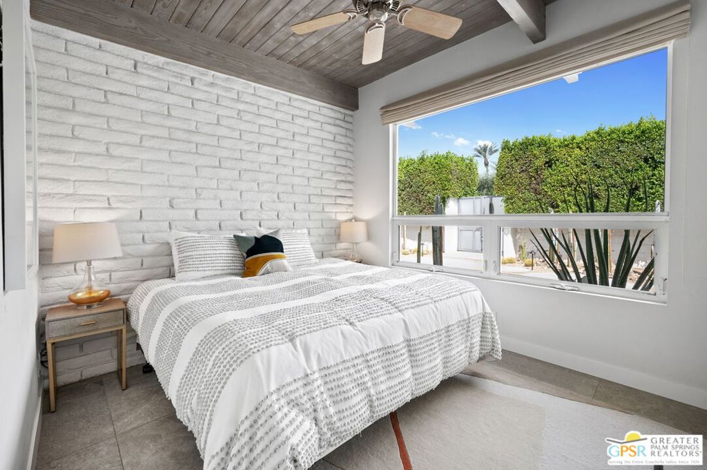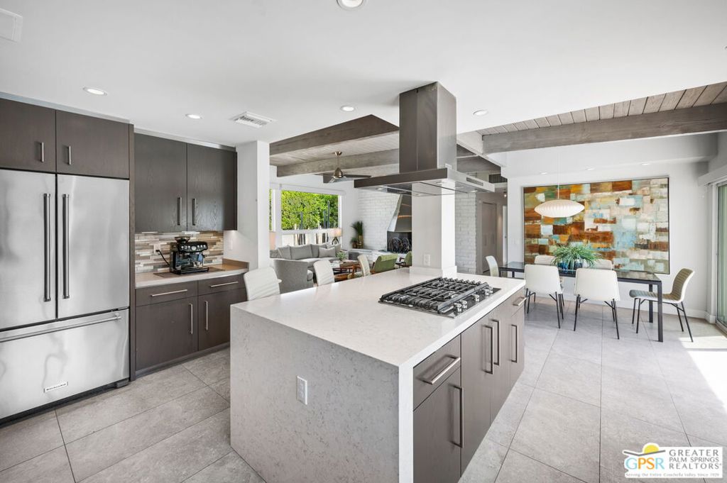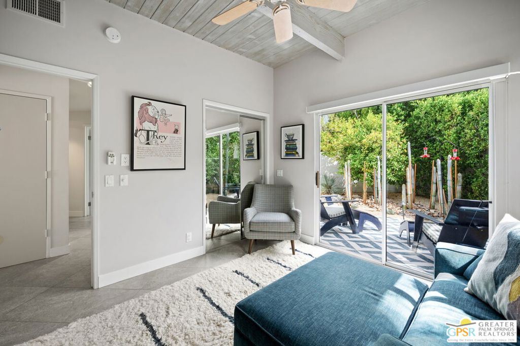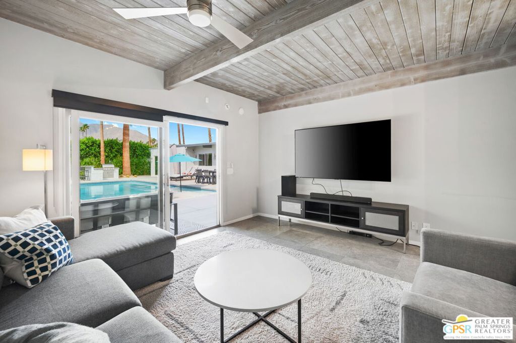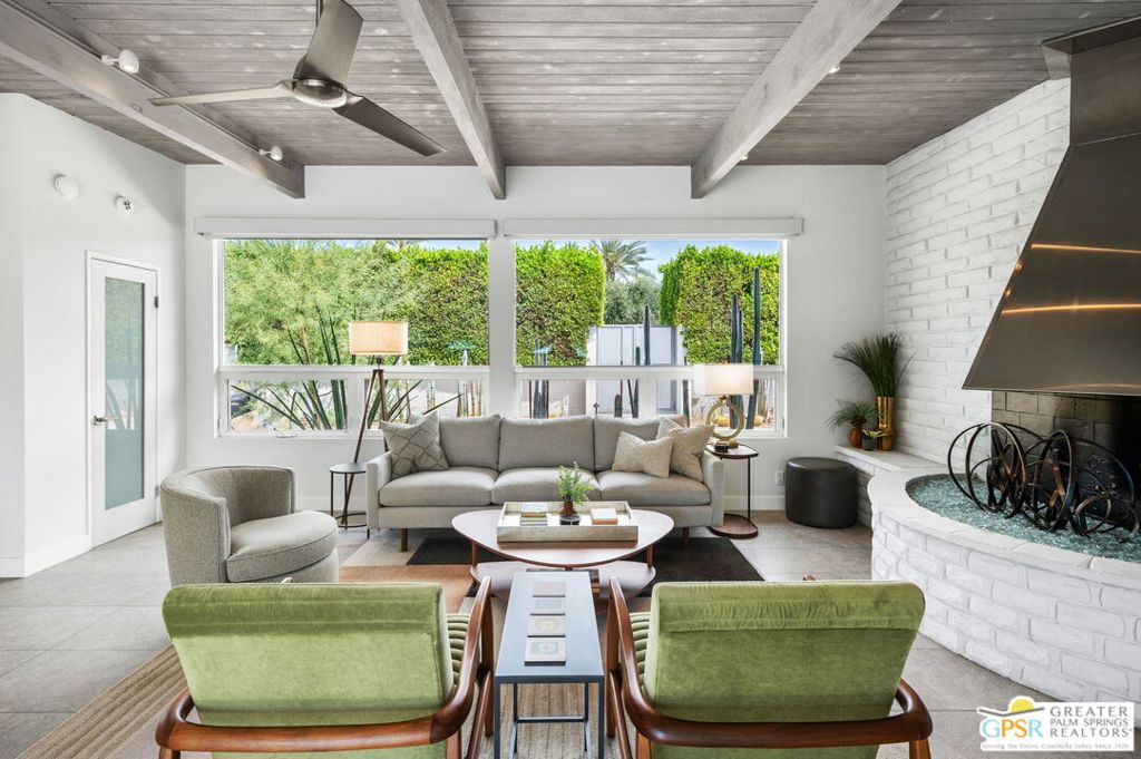 Tucked behind a lush privacy hedge, this spectacular mid-century modern residence is the crown jewel of the block where timeless design meets sophisticated upgrades and stunning mountain views steal the show. Expansive walls of glass flood the interiors with natural light, seamlessly blending indoor and outdoor living. The resort-style saline pool and professionally designed garden create an oasis of relaxation and beauty, framed by mountain vistas and curated landscape lighting. At the heart of the home, the chef's kitchen centers around an oversized island, perfect for both casual mornings and lively gatherings. The main house offers three serene bedrooms including two with direct outdoor access and two spa-inspired bathrooms that exude luxury. Designed for entertaining, the outdoor spaces shine with a brand-new built-in BBQ and bar seating, an inviting fire pit for starlit evenings, and a detached poolside casita complete with wet bar and jaw-dropping views, your guests will never want to leave. Every detail has been elevated: fresh interior and exterior paint, automated irrigation, a burnished steel fireplace sculpture with new gas piping, and a newly added gym space tucked into the garage. Modern conveniences abound, from the Vivint smart security system with cameras, locks, and thermostat, to remote-control electric shades and an EV charger. Situated in the coveted Movie Colony East neighborhood, close to Ruth Hardy Park and the Uptown Design District's acclaimed dining and shopping, this home offers iconic Palm Springs architecture paired with today's most desirable amenities. Offered fully furnished, it is truly the ultimate expression of desert living.