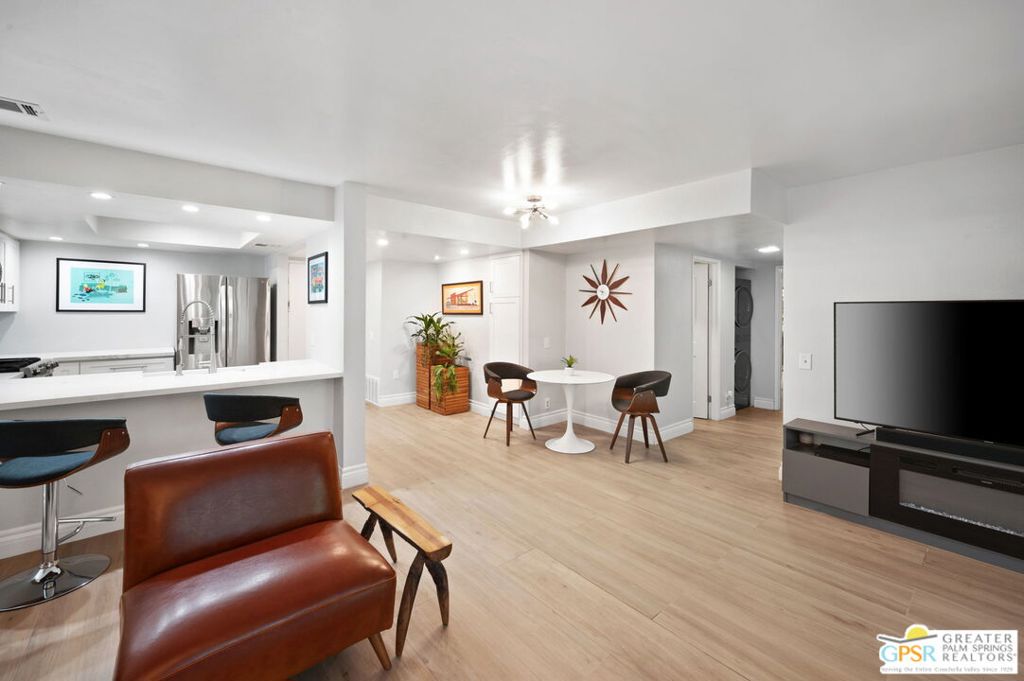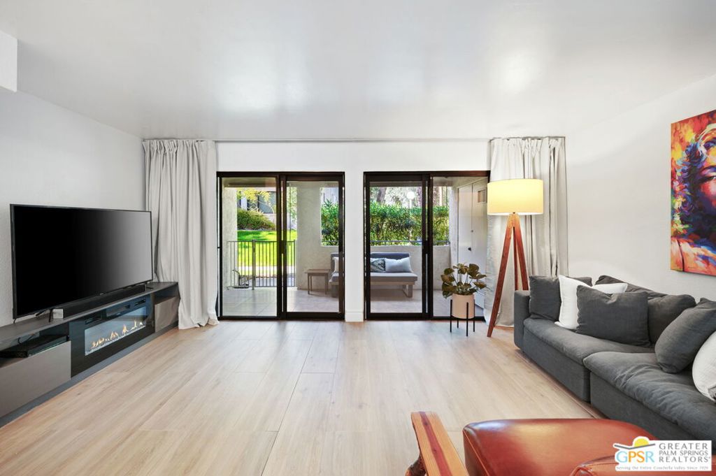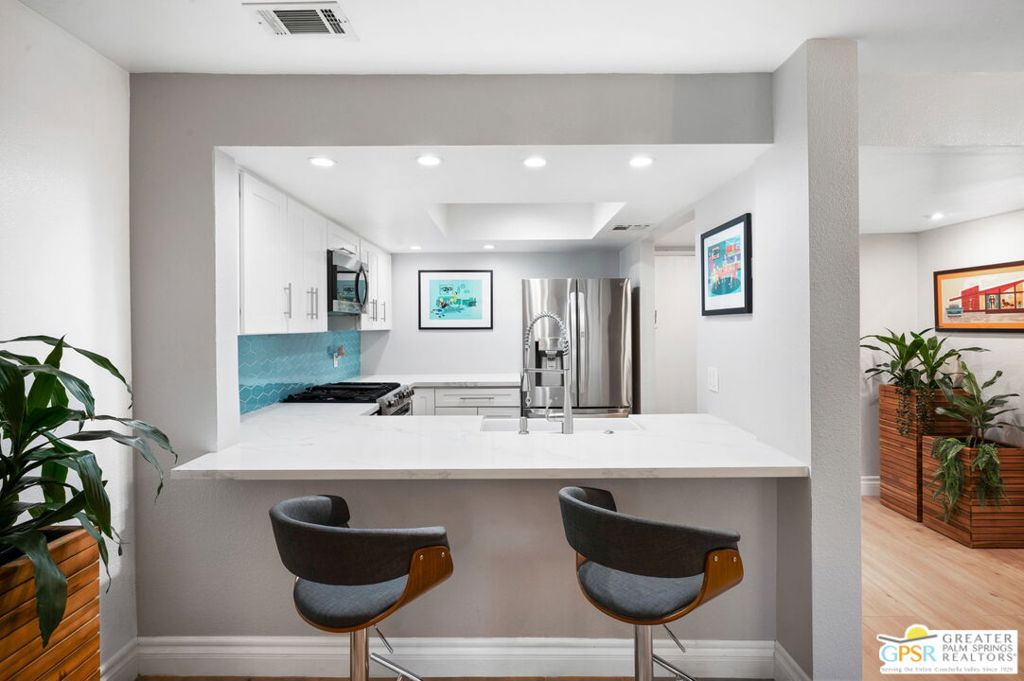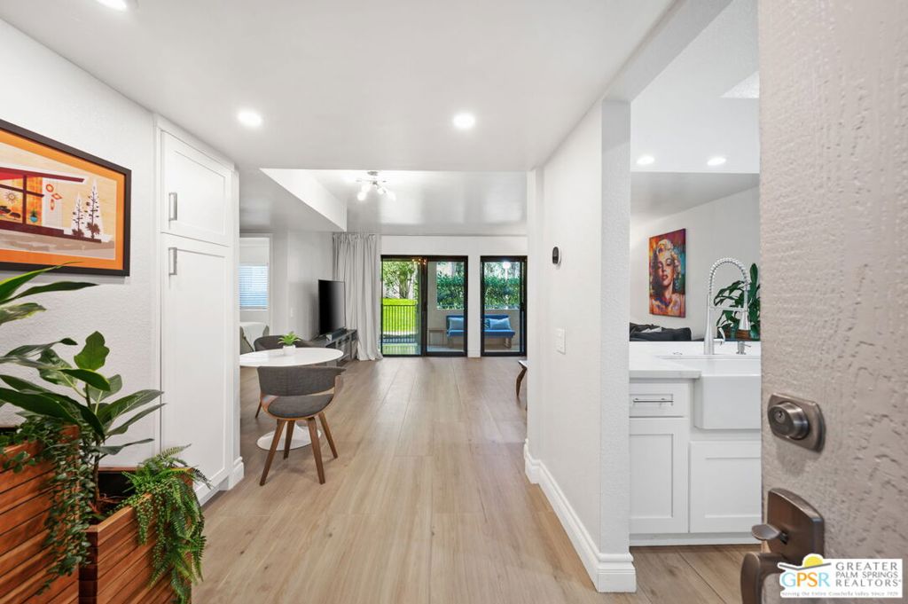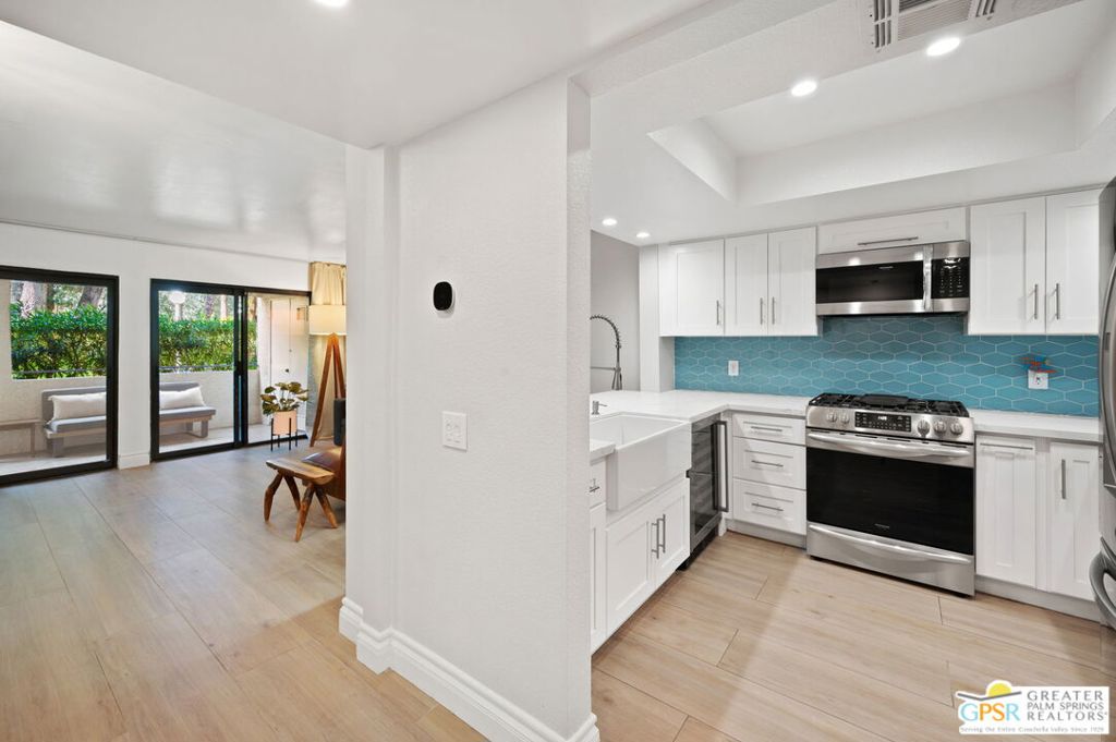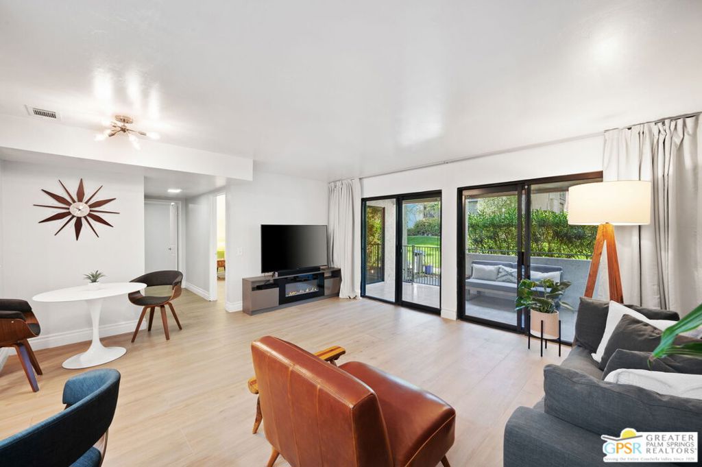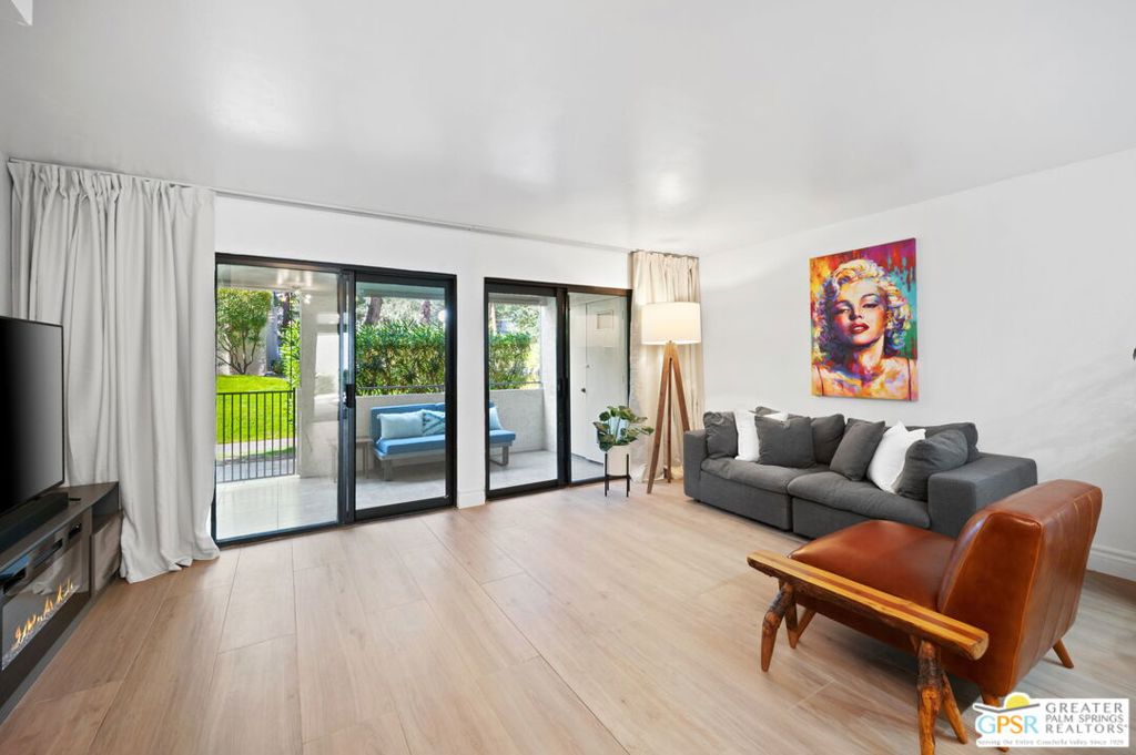 Priced to SELL! Discover Riviera Gardens, a serene retreat nestled in the vibrant heart of Palm Springs! This beautifully updated 2-bedroom, 2-bathroom ground-floor condo is situated on fee land (you own the land) and offers the perfect blend of style, comfort, and convenience. The open floor plan features woodgrain porcelain tile throughout and a wall of floor-to-ceiling sliding glass doors that invite the iconic indoor/outdoor lifestyle Palm Springs is known for. The modern kitchen boasts quartz countertops, soft-close cabinetry, and stainless-steel appliances, including a range with air fryer capability and a porcelain apron-front sink. The spacious primary suite offers dual closets and a tiled shower. The second bedroom, with its own sliding glass doors to the patio, is adjacent to a well-appointed guest bath with a tiled shower and vanity. Additional highlights include a spacious pantry, a stackable washer/dryer conveniently located near the primary suite, double-pane windows, Ecobee thermostat, and a newer HVAC system and water heater. Enjoy assigned covered carport parking with guest parking available. Set in a gated community with lush, manicured grounds, Riviera Gardens offers four sparkling pools and spas, making it a true desert retreat. Ideally located near the Uptown Design District and downtown Palm Springs, you'll have easy access to world-class dining, shopping, and entertainment. This move-in-ready condo is perfect as a full-time residence, vacation getaway, or investment property. Don't miss this opportunity to own your piece of paradise!