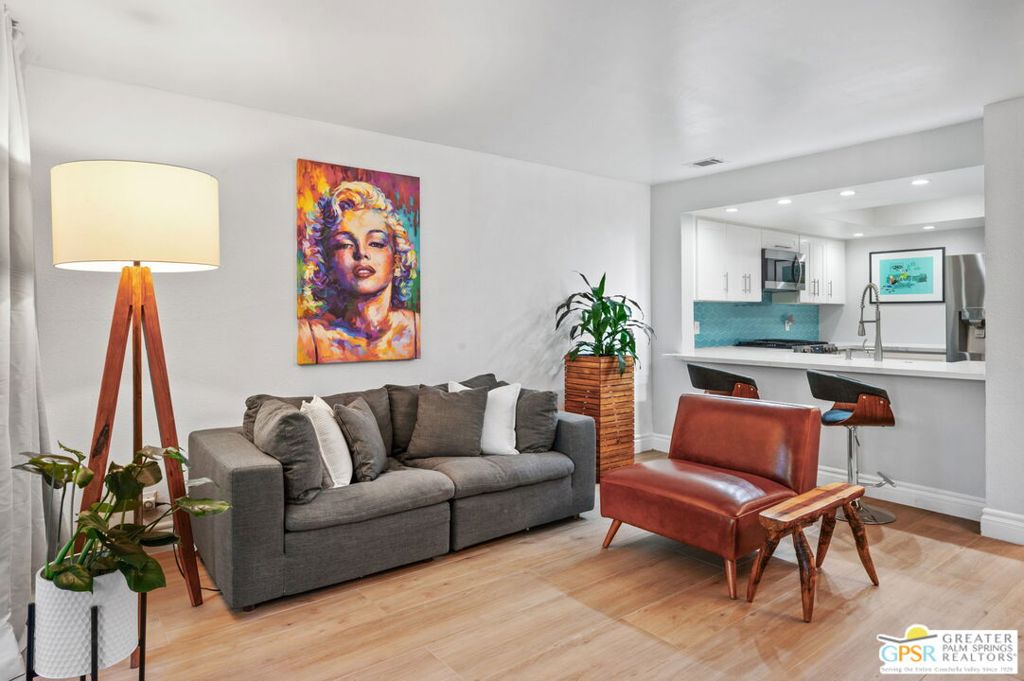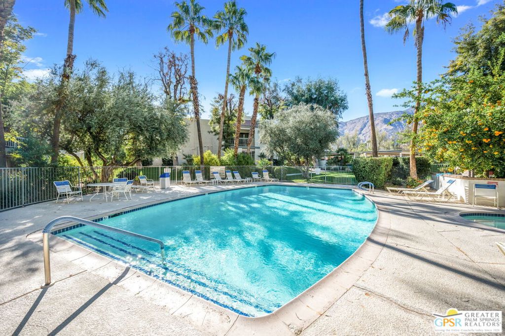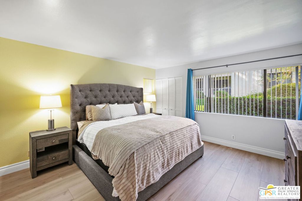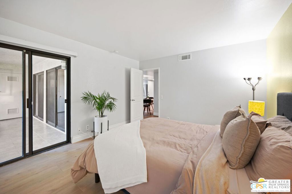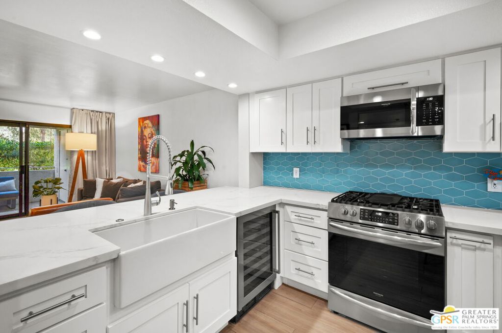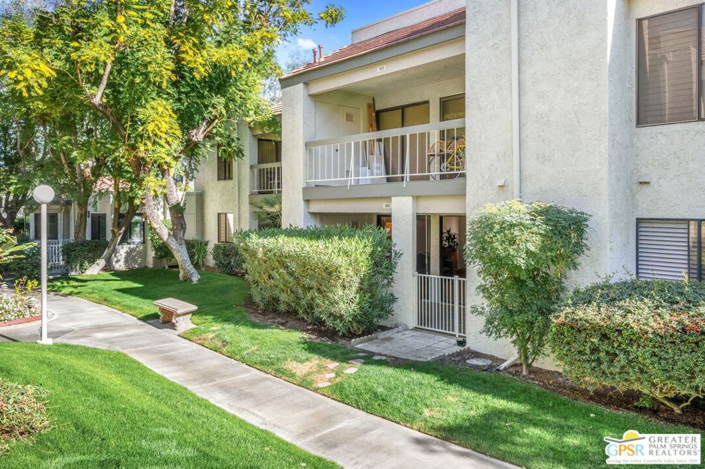 Priced to SELL! Discover Riviera Gardens, a serene retreat nestled in the vibrant heart of Palm Springs! This beautifully updated 2-bedroom, 2-bathroom ground-floor condo is situated on fee land (you own the land) and offers the perfect blend of style, comfort, and convenience. The open floor plan features woodgrain porcelain tile throughout and a wall of floor-to-ceiling sliding glass doors that invite the iconic indoor/outdoor lifestyle Palm Springs is known for. The modern kitchen boasts quartz countertops, soft-close cabinetry, and stainless-steel appliances, including a range with air fryer capability and a porcelain apron-front sink. The spacious primary suite offers dual closets and a tiled shower. The second bedroom, with its own sliding glass doors to the patio, is adjacent to a well-appointed guest bath with a tiled shower and vanity. Additional highlights include a spacious pantry, a stackable washer/dryer conveniently located near the primary suite, double-pane windows, Ecobee thermostat, and a newer HVAC system and water heater. Enjoy assigned covered carport parking with guest parking available. Set in a gated community with lush, manicured grounds, Riviera Gardens offers four sparkling pools and spas, making it a true desert retreat. Ideally located near the Uptown Design District and downtown Palm Springs, you'll have easy access to world-class dining, shopping, and entertainment. This move-in-ready condo is perfect as a full-time residence, vacation getaway, or investment property. Don't miss this opportunity to own your piece of paradise!