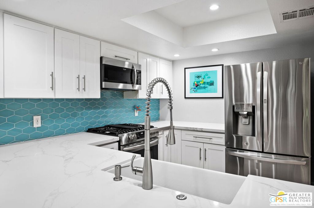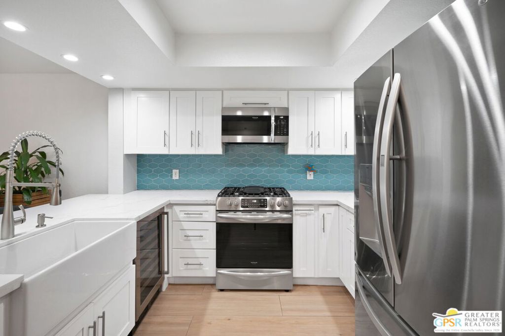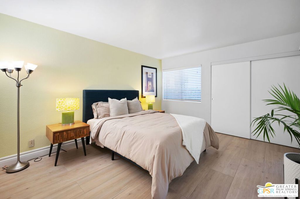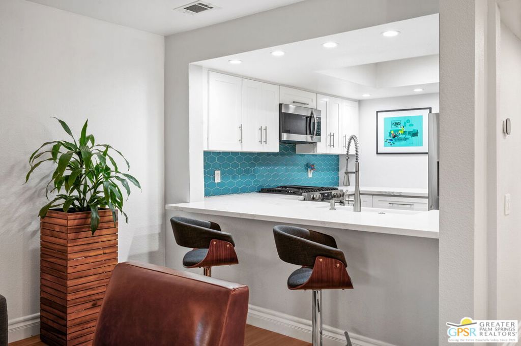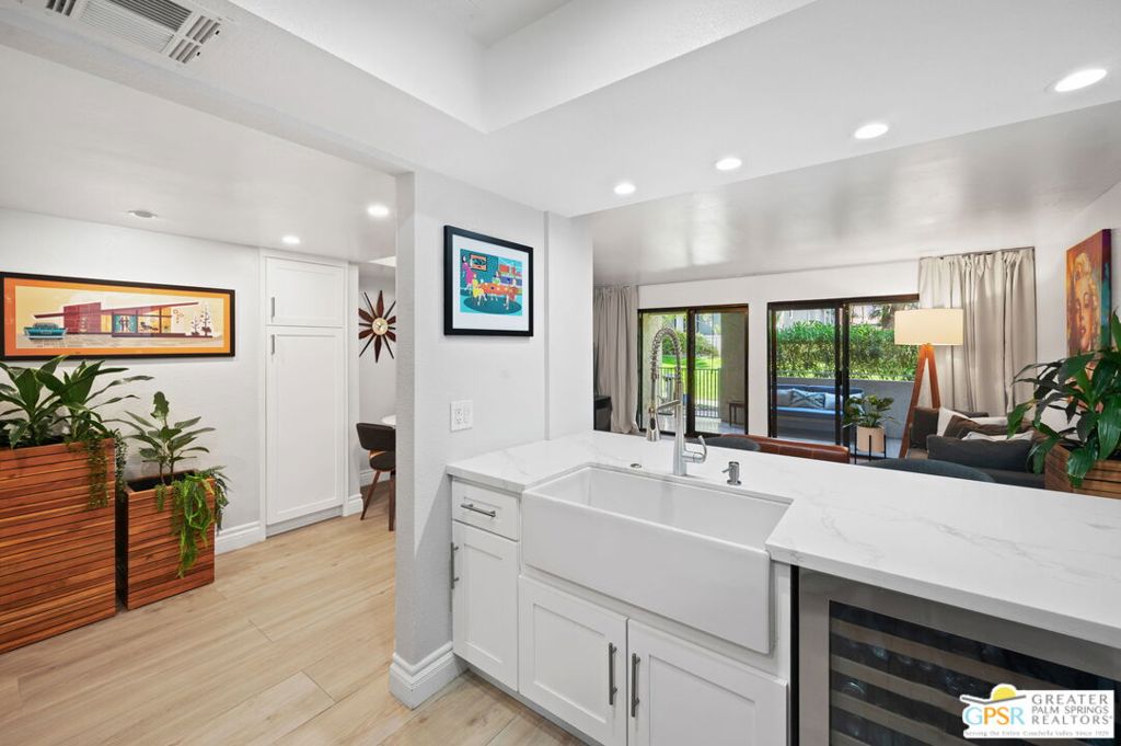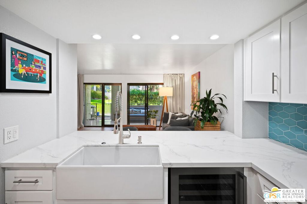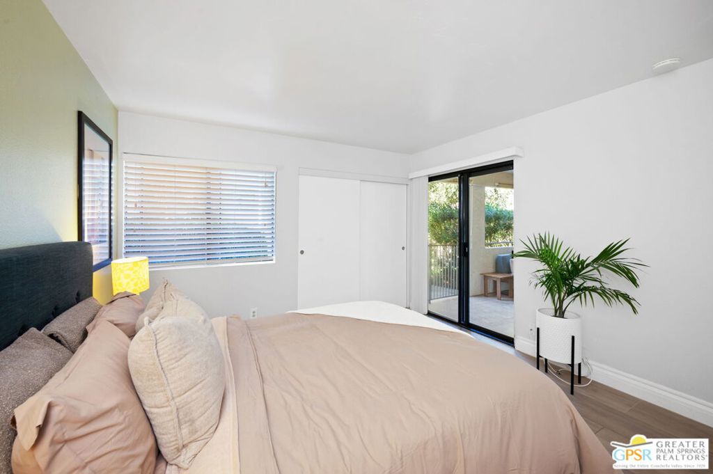 Priced to SELL! Discover Riviera Gardens, a serene retreat nestled in the vibrant heart of Palm Springs! This beautifully updated 2-bedroom, 2-bathroom ground-floor condo is situated on fee land (you own the land) and offers the perfect blend of style, comfort, and convenience. The open floor plan features woodgrain porcelain tile throughout and a wall of floor-to-ceiling sliding glass doors that invite the iconic indoor/outdoor lifestyle Palm Springs is known for. The modern kitchen boasts quartz countertops, soft-close cabinetry, and stainless-steel appliances, including a range with air fryer capability and a porcelain apron-front sink. The spacious primary suite offers dual closets and a tiled shower. The second bedroom, with its own sliding glass doors to the patio, is adjacent to a well-appointed guest bath with a tiled shower and vanity. Additional highlights include a spacious pantry, a stackable washer/dryer conveniently located near the primary suite, double-pane windows, Ecobee thermostat, and a newer HVAC system and water heater. Enjoy assigned covered carport parking with guest parking available. Set in a gated community with lush, manicured grounds, Riviera Gardens offers four sparkling pools and spas, making it a true desert retreat. Ideally located near the Uptown Design District and downtown Palm Springs, you'll have easy access to world-class dining, shopping, and entertainment. This move-in-ready condo is perfect as a full-time residence, vacation getaway, or investment property. Don't miss this opportunity to own your piece of paradise!