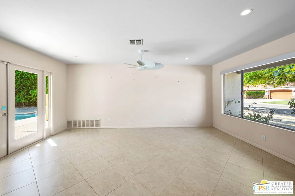 Set along the fairway on a generous, nearly quarter-acre lot, this 1965-built residence blends classic mid-century character with a fresh, modern edge. Clean lines and an open, airy layout set the tone, creating a light-filled environment that feels both relaxed and refined. French doors invite seamless indoor-outdoor living, opening to a private backyard retreat complete with pool and spa, perfect for enjoying desert sunshine and golf course views. Inside, tile flooring flows throughout, complemented by recessed lighting that enhances the home's bright, contemporary feel. The kitchen offers both style and function with stainless steel appliances, granite countertops, and a sleek glass tile backsplash. A dual-sided fireplace anchors the living and family rooms, adding warmth and architectural interest to the central gathering spaces. Thoughtful upgrades include a tankless water heater, indoor laundry, and dual sinks in the primary suite. The guest bath makes a bold statement with its eye-catching glossy red vanity and additional storage. Outside, the low-maintenance landscaping allows you to spend more time enjoying the setting and less time maintaining it. This home is ready for its next chapter, an ideal opportunity for a buyer to move in, personalize, and make it their own piece of Palm Springs living.